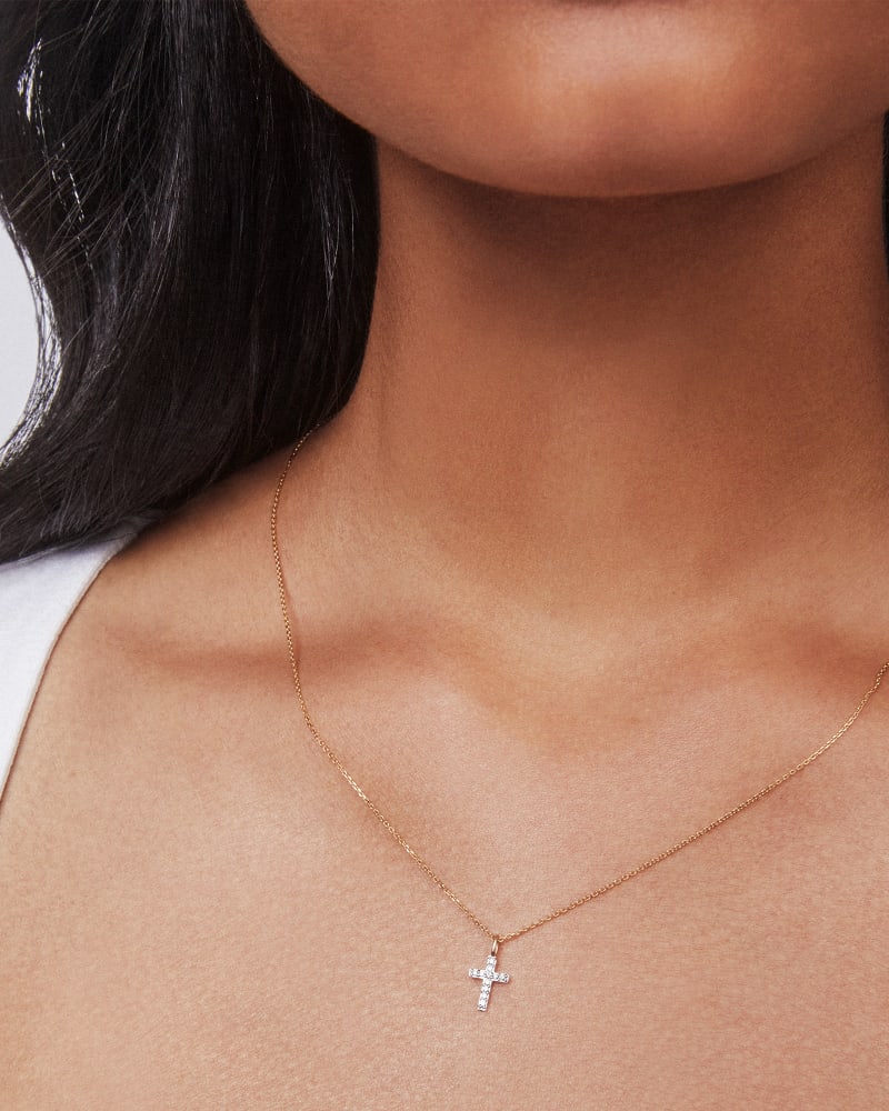 A meaningful symbol dressed in diamonds, the Cross 14k Yellow Gold Pendant Necklace in White Diamonds brings new life to a classic. This 14k Yellow Gold pendant necklace is designed to bring maximum sparkle to a petite piece that you can wear every day both layered and alone. Personalize your style with the Cross 14k Yellow Gold Pendant Necklace, a forever accessory with modern timelessness.