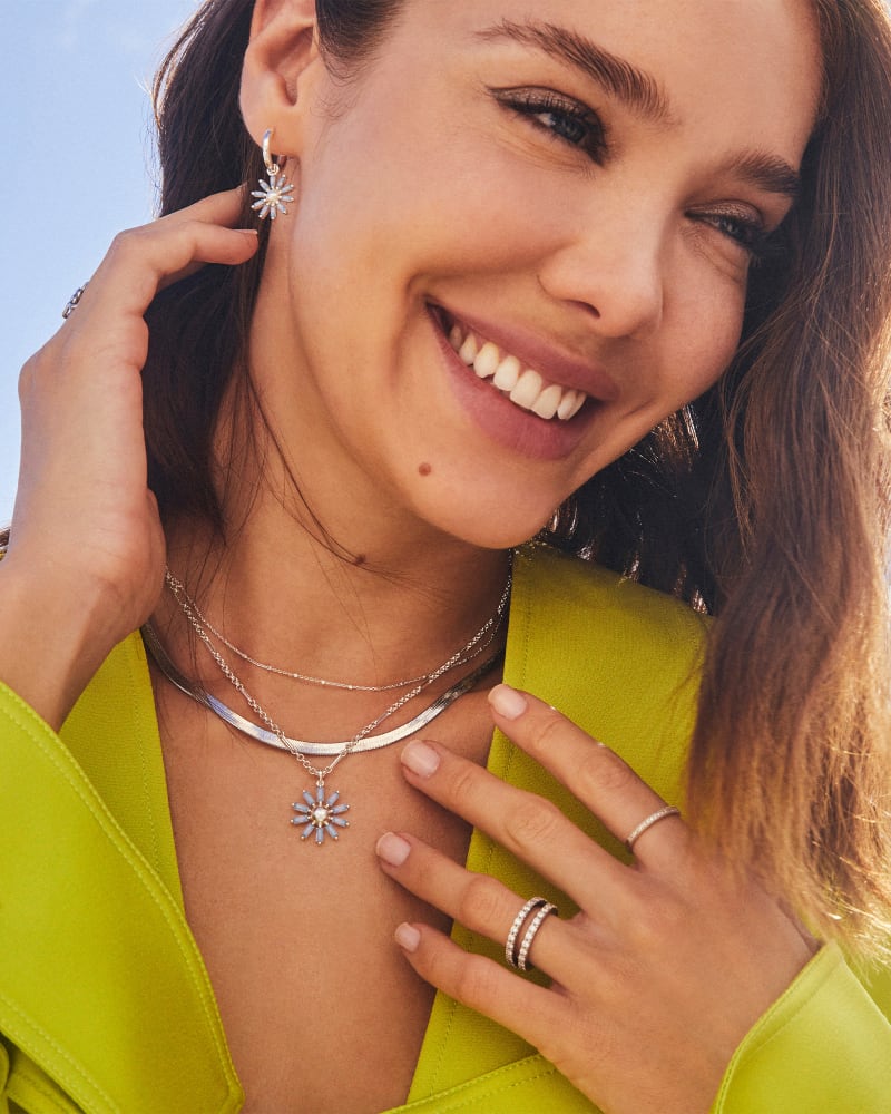 The Madison Daisy Bright Silver Short Pendant Necklace in Light Blue Opal Crystal features a petite daisy flower that is always in bloom. Glossy petals are offset by a gleaming metal center hung from a short chain, making this a minimal yet sophisticated statement. Whether you style it on its own or layer it with other pieces, this pendant will be a fresh floral addition to your collection.