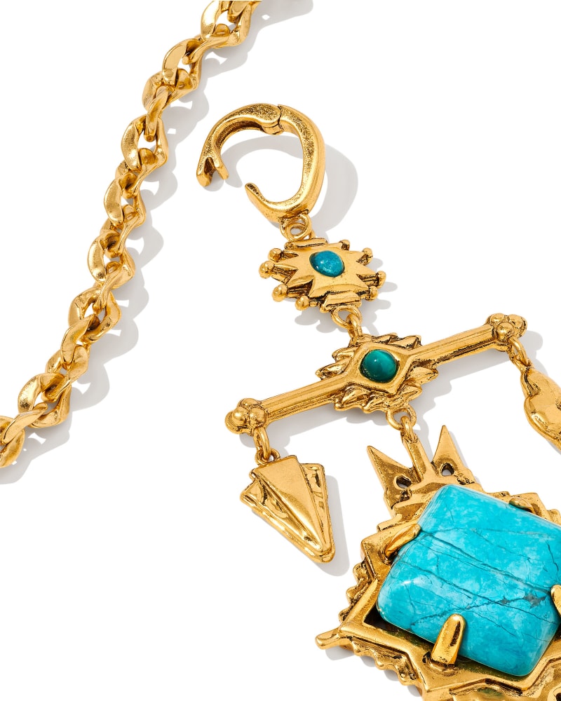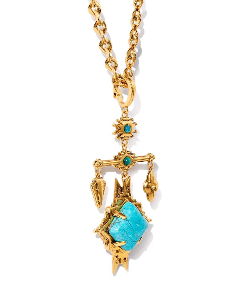 With cascading charms reminiscent of kilim motifs and Southwestern design, the Cass Vintage Gold Large Long Pendant Necklace in Variegated Dark Teal Magnesite is a one-of-a-kind statement piece you