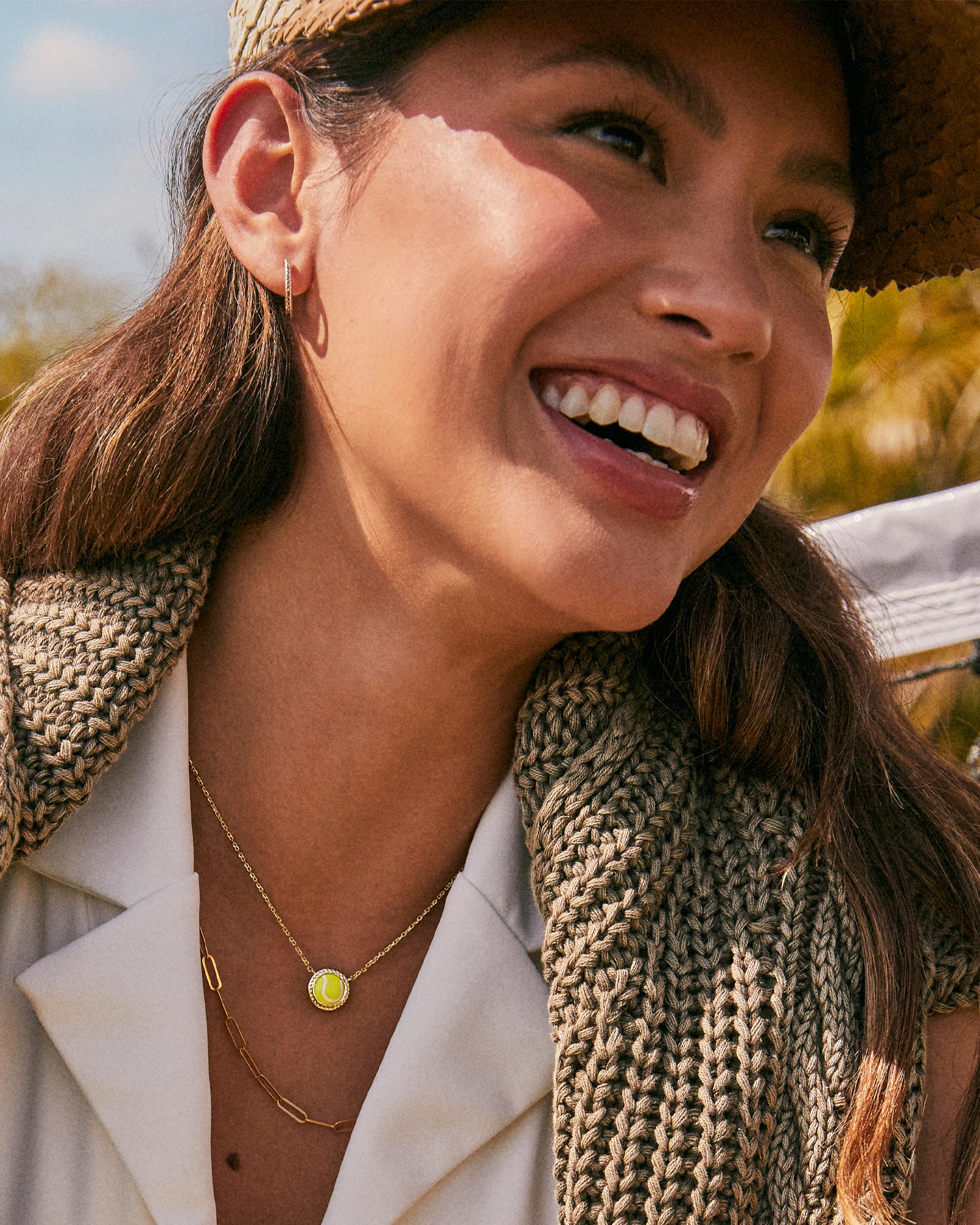 Ace your stack with the Tennis Gold Short Pendant Necklace in Chartreuse Magnesite. Set on an adjustable chain, this pendant is crafted in vibrant chartreuse magnesite with white embellishments. Whenever you’re off the court, this sporty style will show your love for the game.