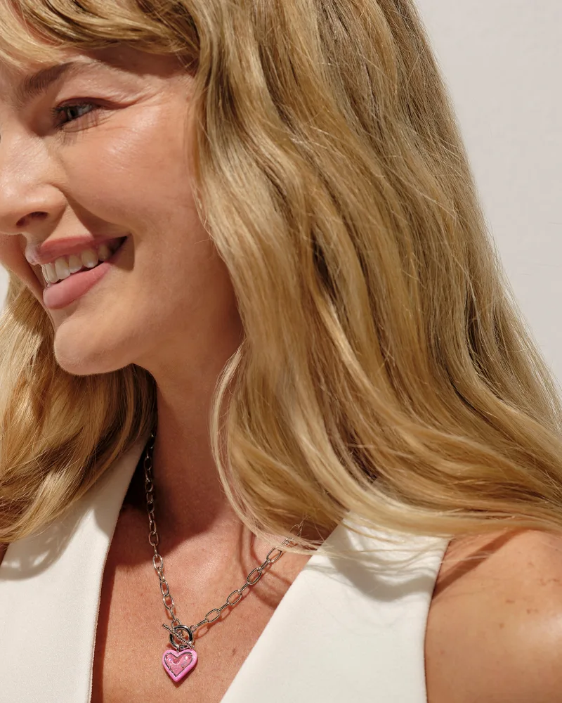 Fall in love all over again with Ari! The Ari Heart Gold Enamel Frame Link and Chain Necklace in Pink Iridescent Glitter Glass features our bestselling heart shape, surrounded by a color-coordinated enamel frame and set on a trendy link chain with a toggle closure. It's convertible, too: wear the heart charm for a touch of romance or remove it for a chic all-metal moment.