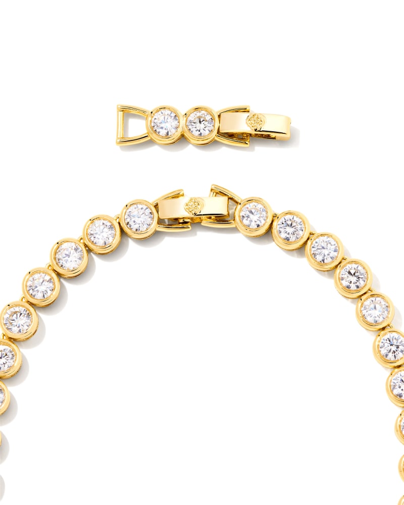 Make a statement with the Carmen Gold Tennis Necklace in White Crystal. Between the showstopping silhouette and dazzling gemstones, wear this eye-catching necklace when you want to be seen.